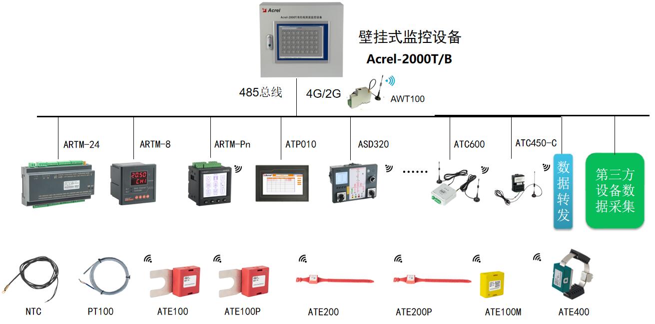 可嵌入式安裝在高低壓柜內(nèi)搭配ATE系列傳感器使用,接收4個(gè)ATC450-C或者1ATC600;帶有一路下行RS485接口,一路上行RS485接口,一路上行以太網(wǎng)接口。